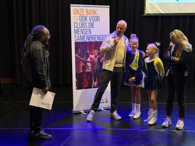 Op deze avond waren alle verenigingen van Laarbeek uitgenodigd en natuurlijk was iedereen benieuwd wat de opbrengst zou zijn van deze campagne. Saar en Keet mochten deze cheque in ontvangst nemen van Marlon Kicken en daarop stond het mooie bedrag van €450,42. Dit geld kan o.a. besteed worden aan nieuwe tenues voor de Dansmariekes. Later gingen de dames nog op de film met de cheque zie hieronder de link naar dit filmpje.